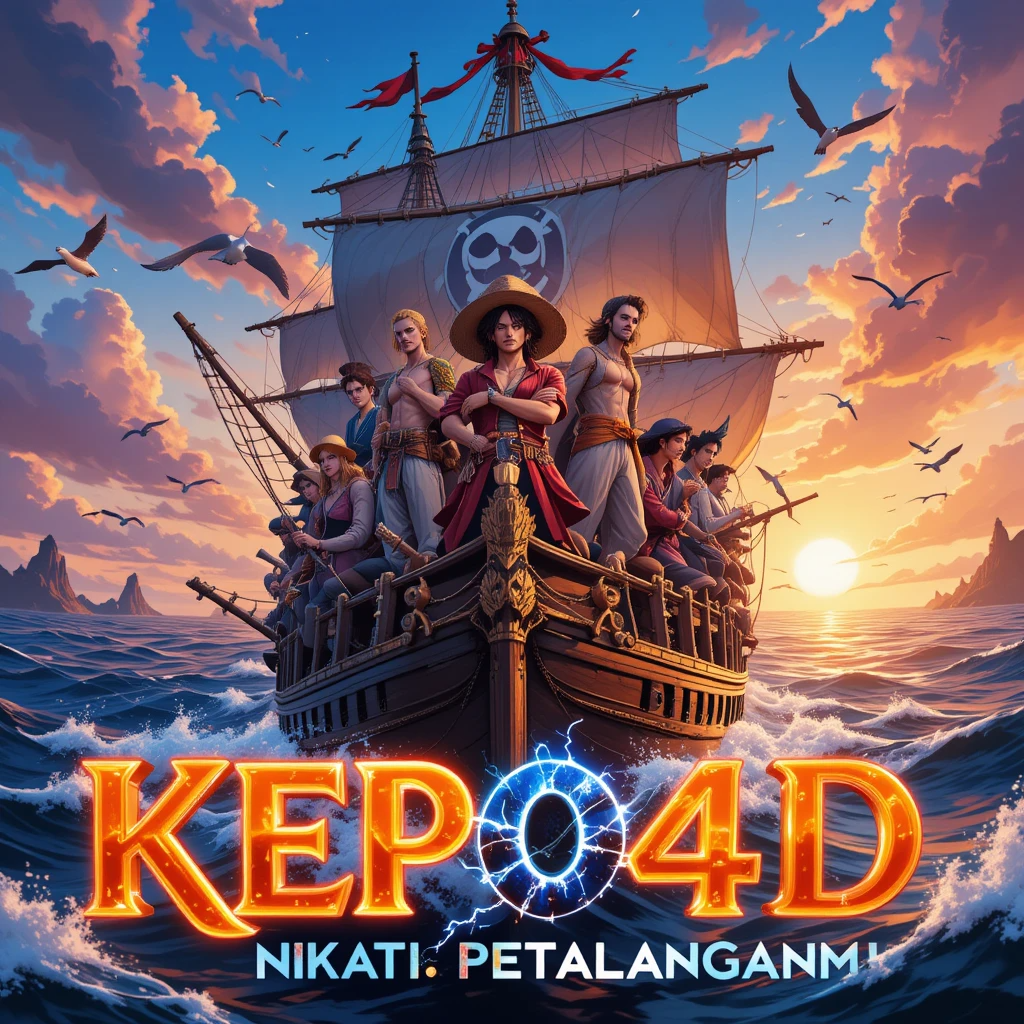 Gambar yang Anda lihat bukan sekadar ilustrasi biasa—ia adalah pintu masuk menuju dunia fantasi yang mendebarkan. Sebuah kapal besar dengan layar raksasa bertuliskan simbol KEPO4D menantang lautan luas. Di sekelilingnya, awan jingga dan burung-burung laut menambah atmosfer dramatis yang membawa nuansa eksplorasi dan kemerdekaan. Para karakter di kapal mencerminkan semangat keberanian, kerjasama tim, dan tentunya, tekad untuk meraih harta karun besar—simbol dari jackpot besar yang menanti para pemain.