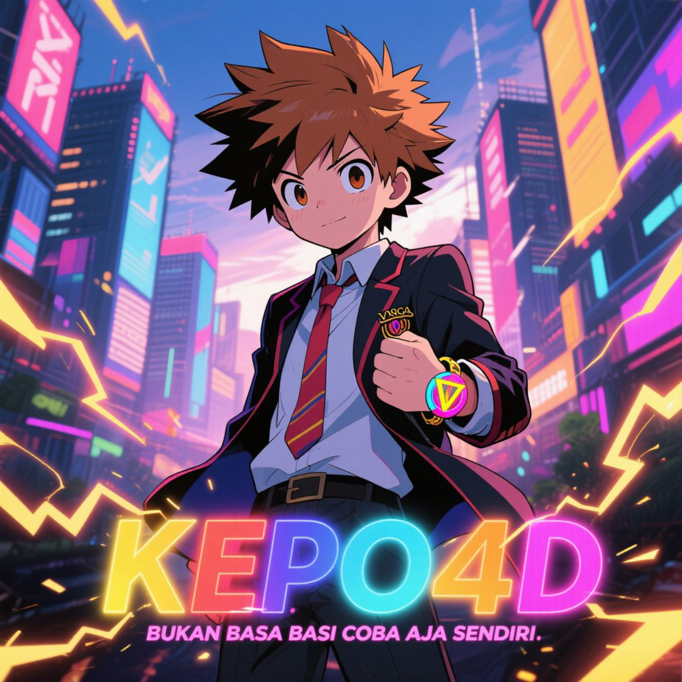 Latar belakangnya adalah kota metropolis yang menyala dengan neon warna-warni, menghadirkan nuansa masa depan yang penuh inovasi. Cahaya listrik yang berkilat di sekitar sang karakter memberikan kesan energi yang tidak terbendung — energi yang menggambarkan KEPO4D sebagai platform yang tidak hanya mengikuti tren, tapi juga menciptakannya.