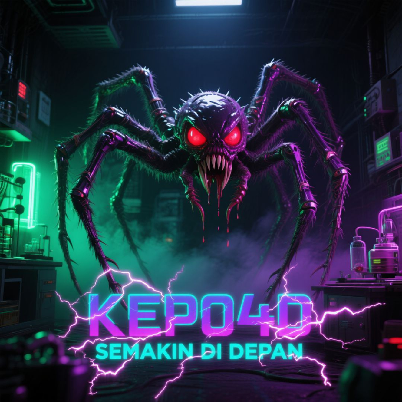 Gambar utama KEPO4D menghadirkan seekor laba-laba mekanik berbalut nuansa neon ungu dan hijau, dengan efek petir yang memperkuat kesan kekuatan dan kontrol. Warna neon yang tajam, perpaduan antara sains dan horor, serta setting laboratorium futuristik menggambarkan sebuah dunia digital yang ekstrem namun terkendali—dunia di mana KEPO4D adalah penguasanya.