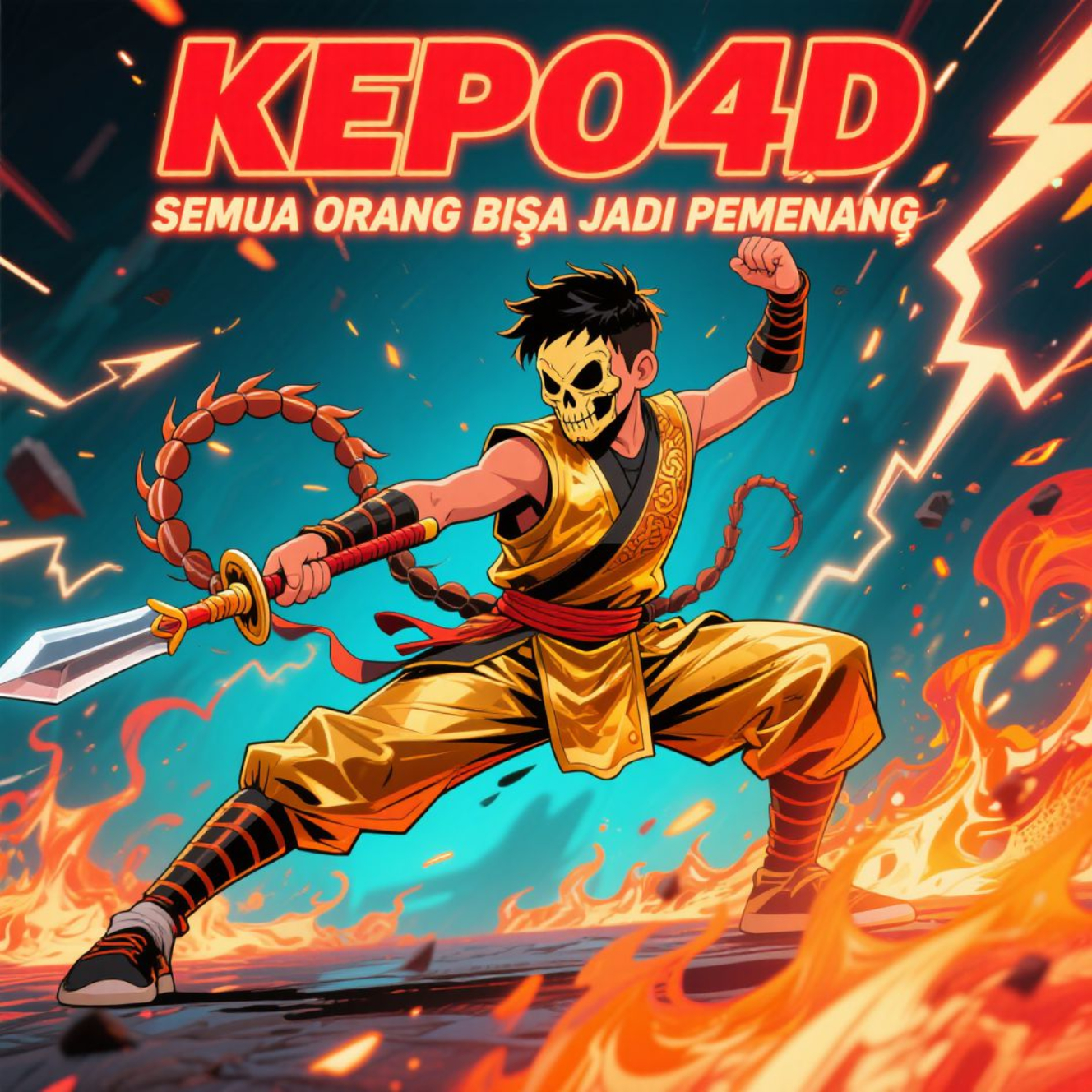 Dalam gambar ini, kita melihat seorang karakter yang tampaknya sedang bersiap untuk bertempur. Ia mengenakan pakaian khas kungfu berwarna emas yang menonjolkan kesan kekuatan dan kebijaksanaan. Sementara itu, topeng tengkorak yang dikenakan di wajahnya memberikan sentuhan misterius, menggambarkan keberanian yang tidak takut akan tantangan besar. Dalam dunia kompetisi, karakter ini bisa diartikan sebagai simbol dari setiap orang yang berjuang untuk menjadi pemenang, siap menghadapi segala rintangan dan tetap teguh pada tujuan.