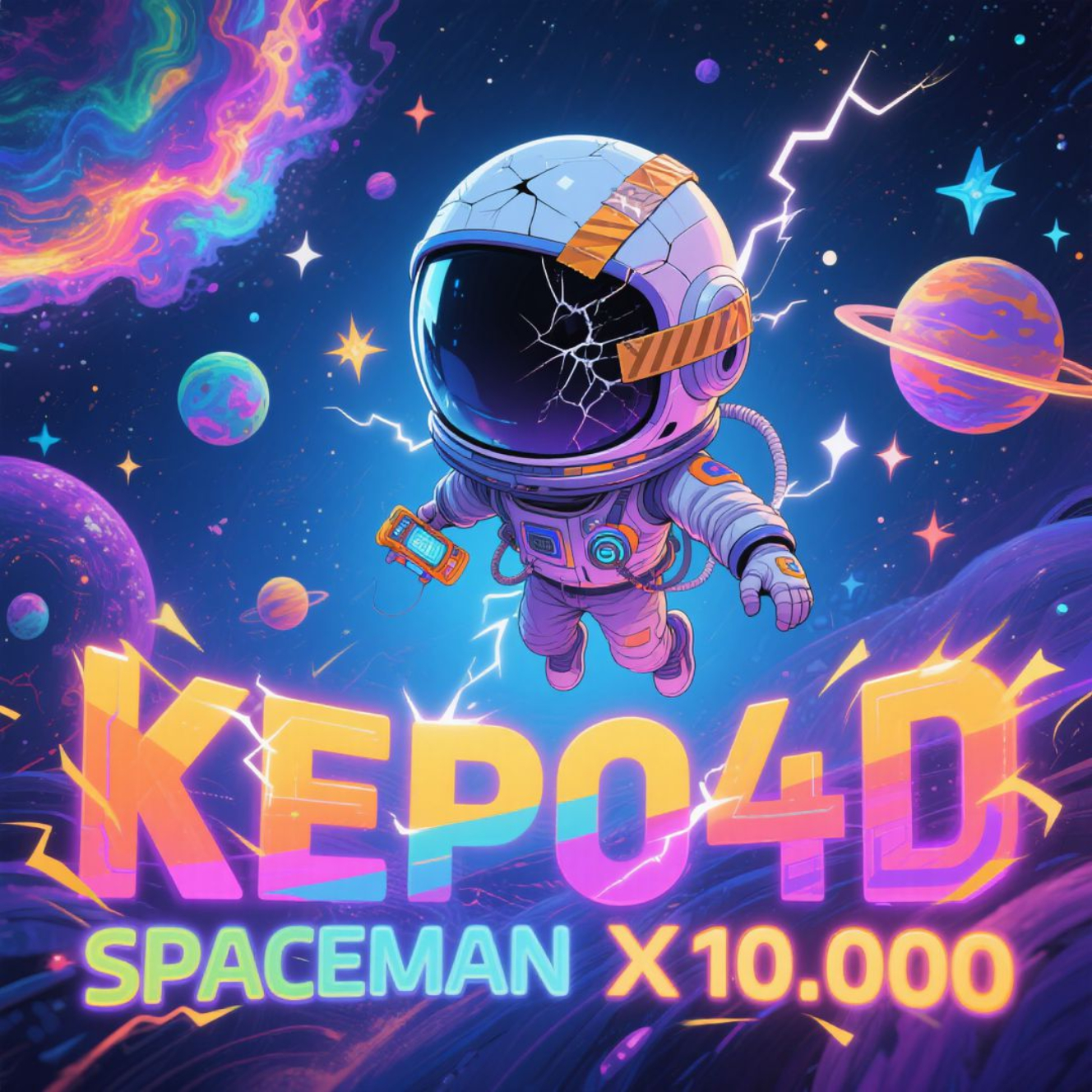 Warna-warna cerah seperti ungu, biru galaksi, dan oranye terang memberikan kesan futuristik dan penuh energi. Tulisan “KEPO4D” dalam font tebal dan bercahaya menandakan otoritas serta kredibilitas, sementara tagline “SPACEMAN X10.000” dengan highlight warna emas mempertegas nilai hadiahnya.